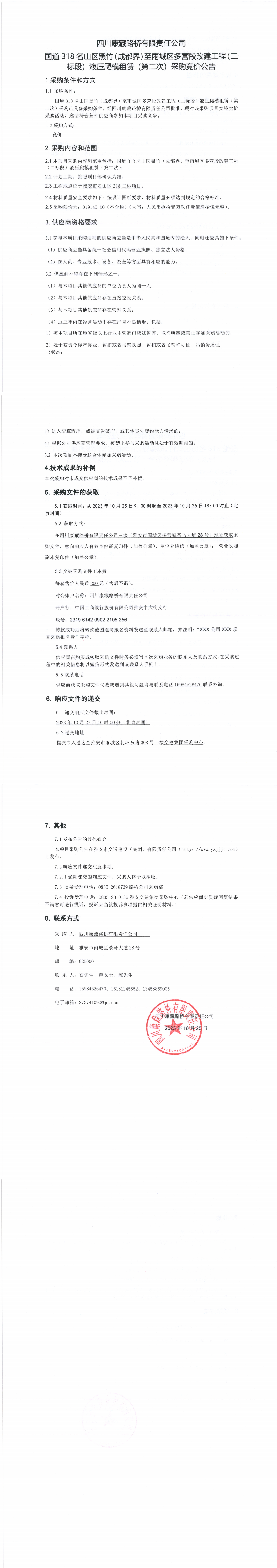 四川康藏路桥有限责任公司国道318名山区黑竹(成都界)至雨城区多营段改建工程二标段液压爬模租赁(第二次)采购竞价公告