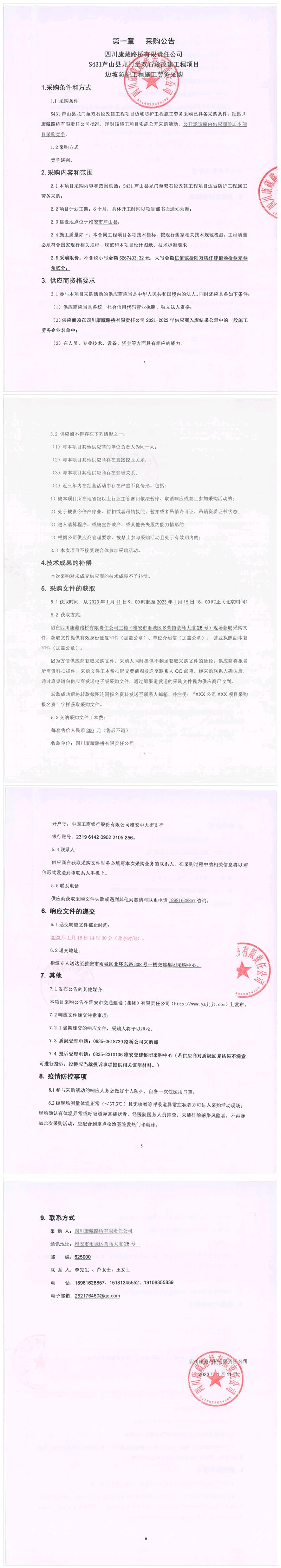 四川康藏路桥有限责任公司S431芦山县龙门至双石段改建工程项目边坡防护工程施工劳务采购竞争谈判结果公示