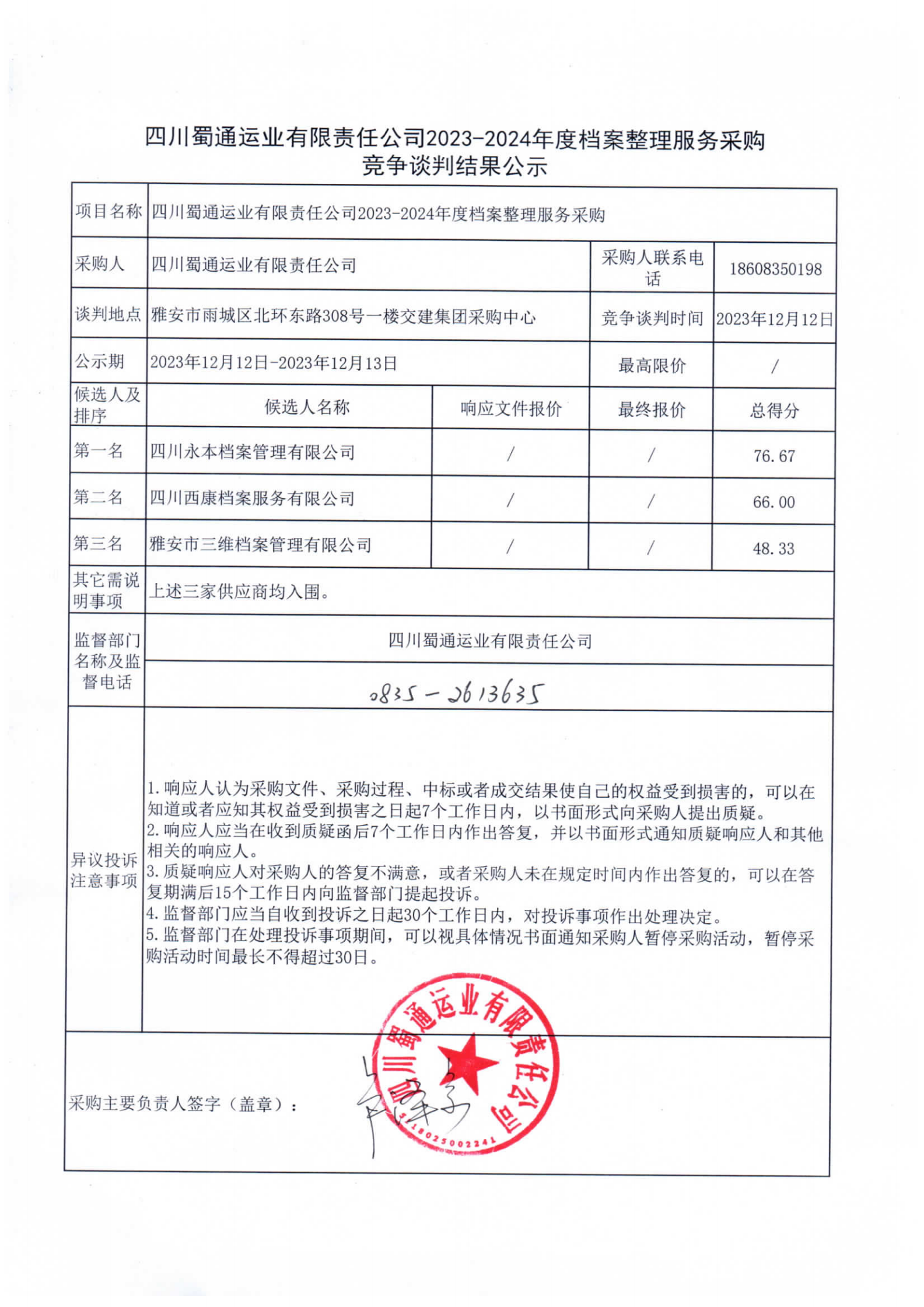 四川蜀通运业有限责任公司2023-2024年度档案整理服务采购竞争谈判结果公示