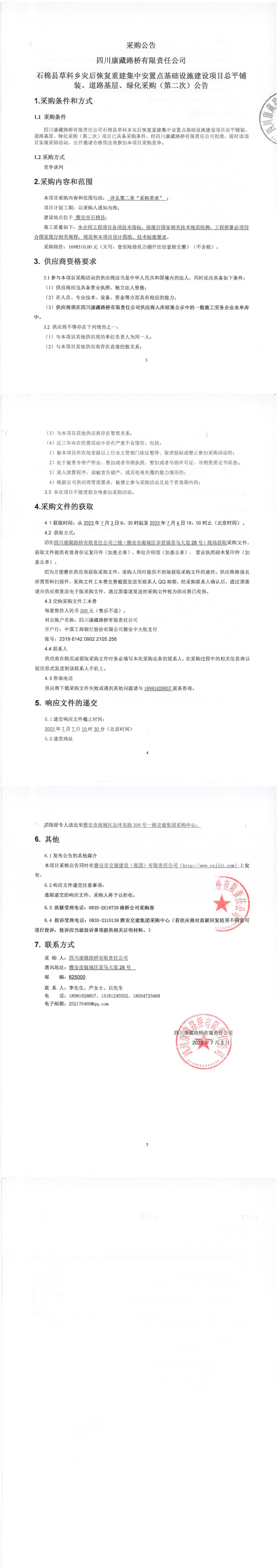 四川康藏路桥有限责任公司石棉县草科乡灾后恢复重建集中安置点基础设施建设项目总平铺装、道路基层、绿化采购(第二次)公告