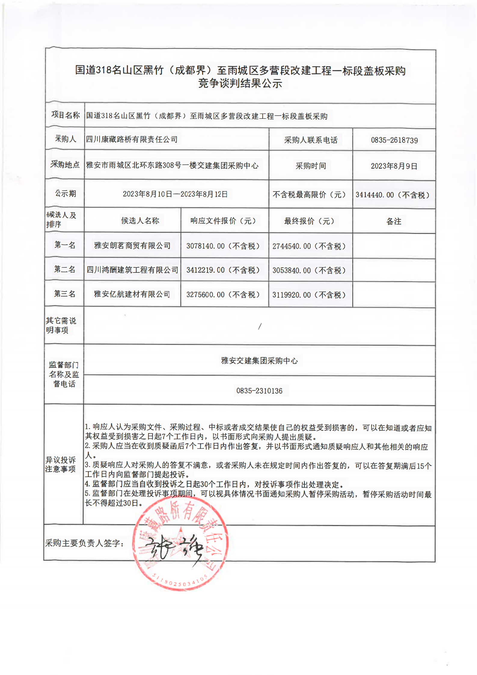 四川康藏路桥有限责任公司国道318名山区黑竹(成都界)至雨城区多营段改建工程一标段盖板采购竞争谈判结果公示