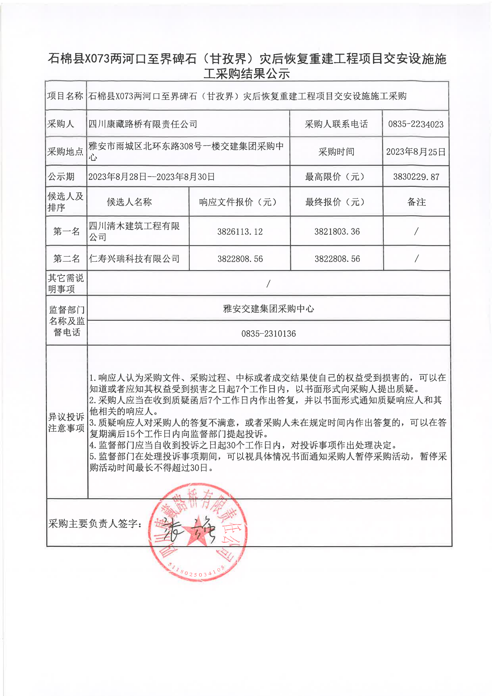 四川康藏路桥有限责任公司石棉县X073两河口至界碑石(甘孜界)灾后恢复重建工程项目交安设施施工采购结果公示