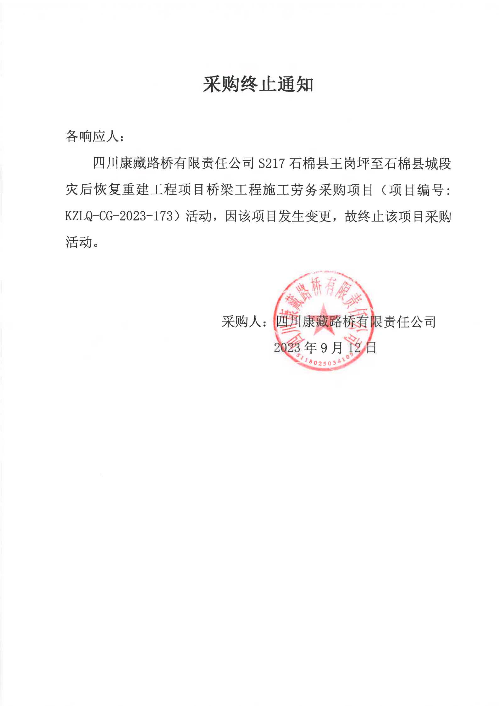 四川康藏路桥有限责任公司S217石棉县王岗坪至石棉县城段灾后恢复重建工程项目桥梁工程施工劳务项目采购终止通知