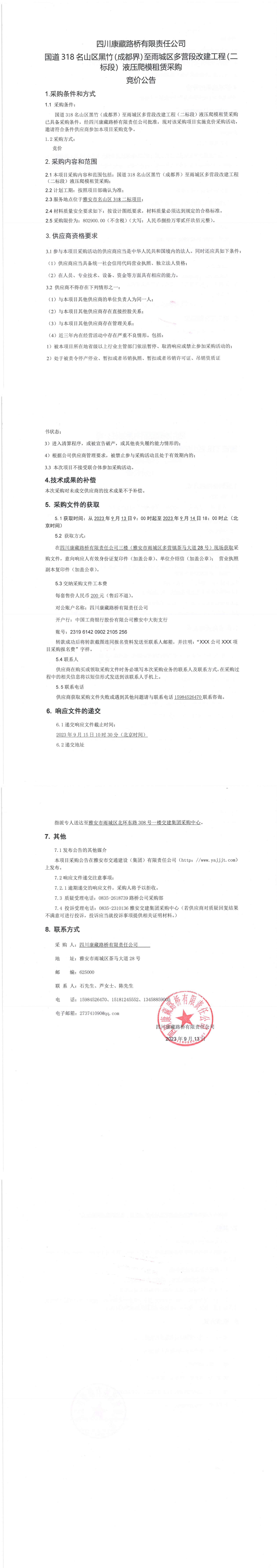 四川康藏路桥有限责任公司国道318名山区黑竹(成都界)至雨城区多营段改建工程(二标段)液压爬模租赁采购竞价公告