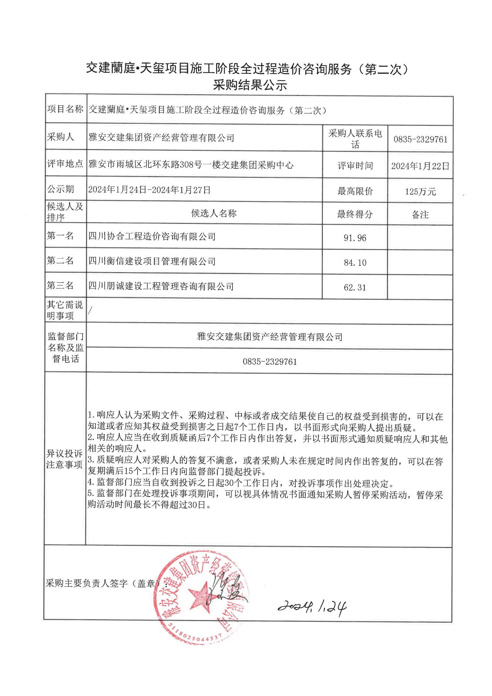 威廉希尔集团资产经营管理有限公司交建蘭庭·天玺项目施工阶段全过程造价咨询服务(第二次)采购结果公示