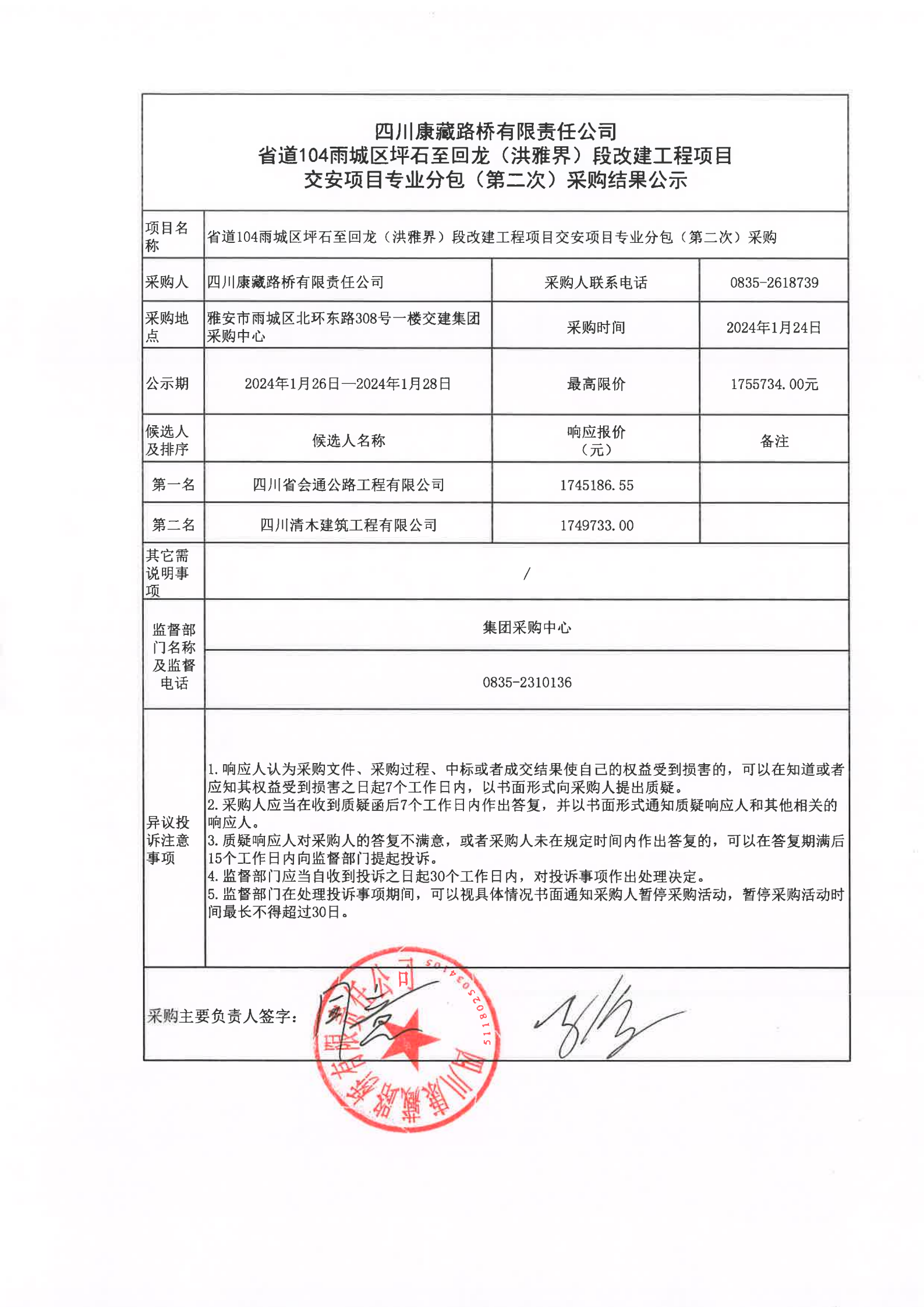 四川康藏路桥有限责任公司省道104雨城区坪石至回龙(洪雅界)段改建工程项目交安项目专业分包(第二次)采购结果公示