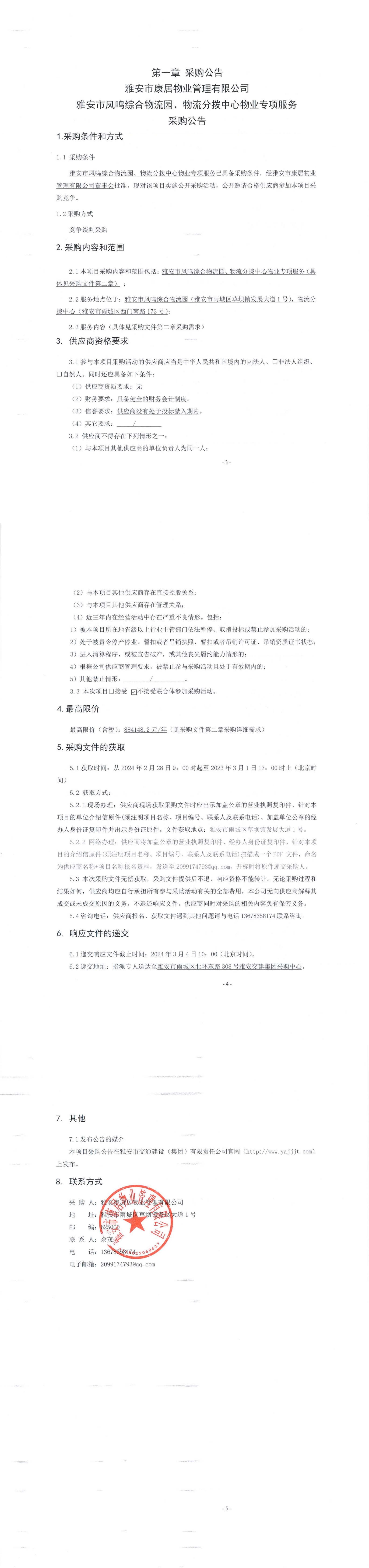 雅安市康居物业管理有限公司雅安市凤鸣综合物流园、物流分拨中心物业专项服务采购公告