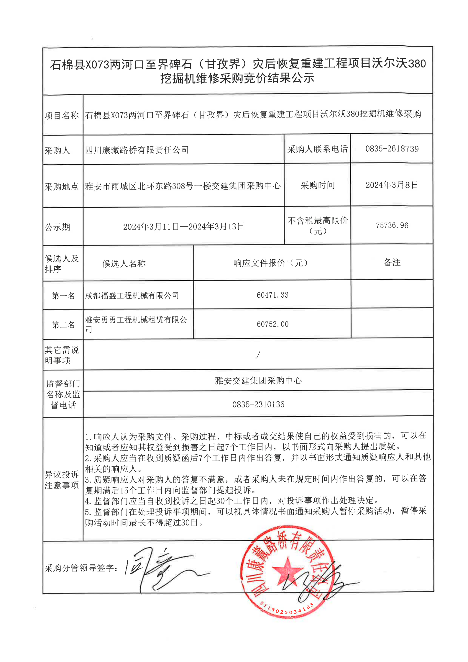 四川康藏路桥有限责任公司石棉县X073两河口至界碑石(甘孜界)灾后恢复重建工程项目沃尔沃380挖掘机维修采购竞价结果公示