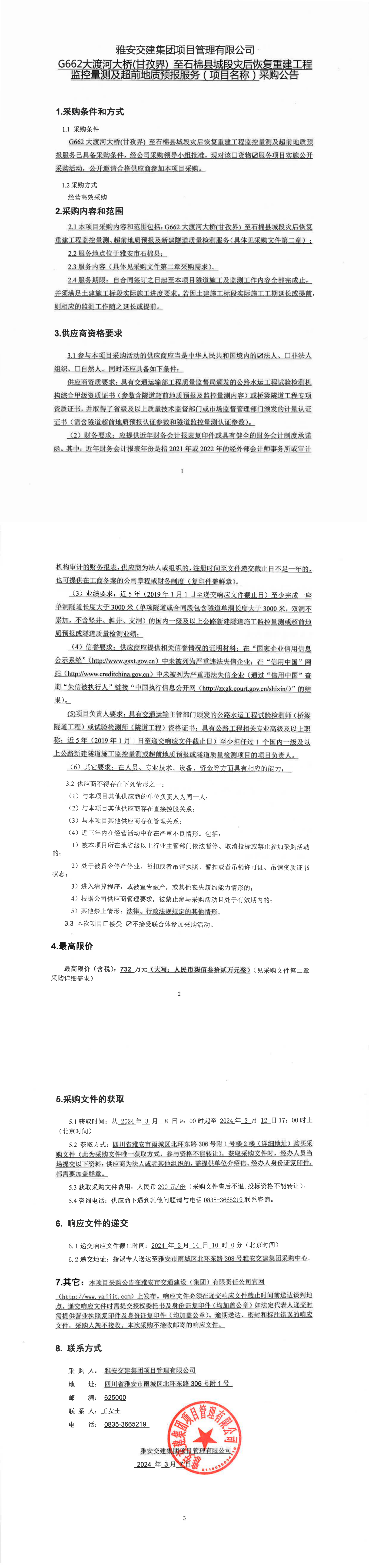 威廉希尔集团项目管理有限公司G662大渡河大桥(甘孜界)至石棉县城段灾后恢复重建工程监控量测及超前地质预报服务(项目名称)采购公告