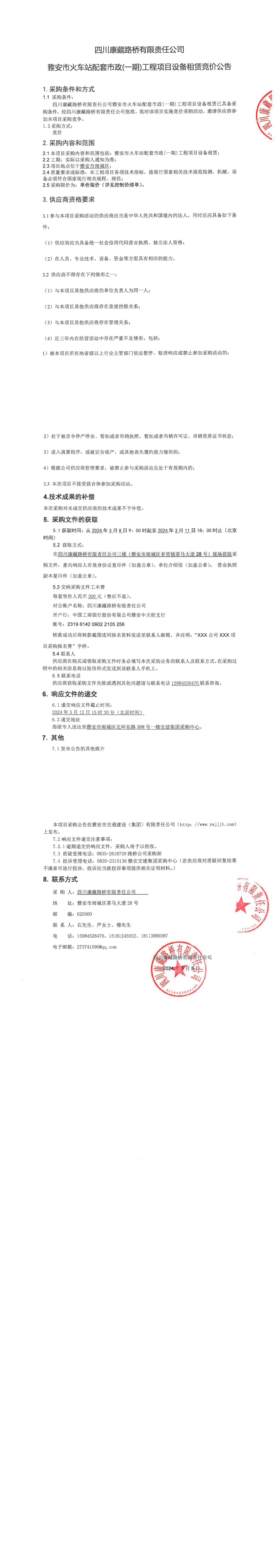 四川康藏路桥有限责任公司雅安市火车站配套市政(一期)工程项目设备租赁竞价公告