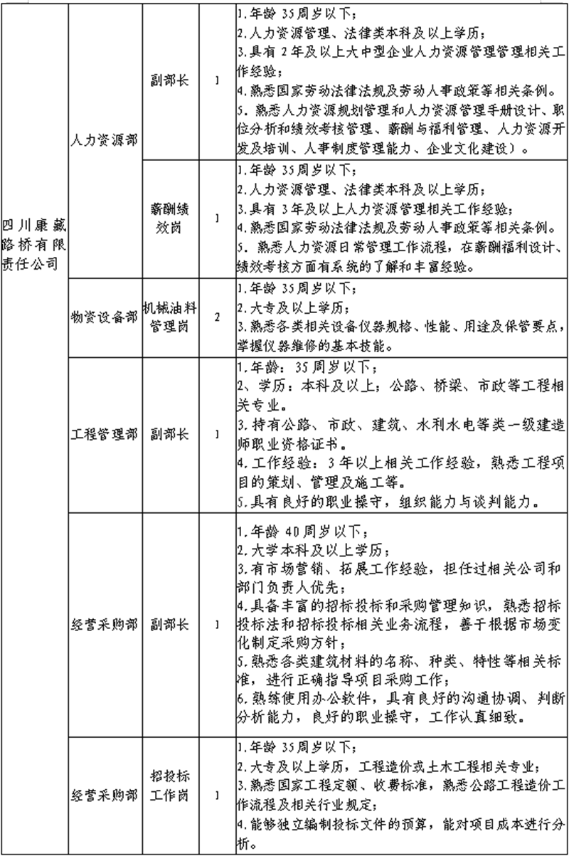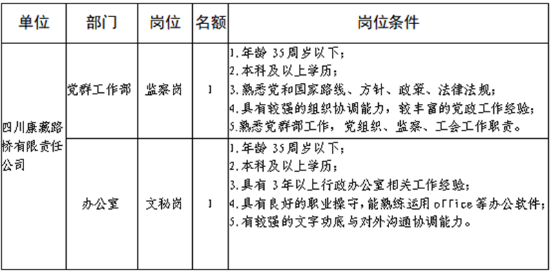 根据开展需要,决定面向社会公开招聘雅安市交通建设(集团)有限责任公司(以下简称“威廉希尔集团”)所属子公司工作人员16名,现将有关事项公告如下: