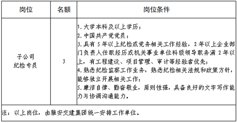 根据开展需要,决定面向社会公开招聘雅安市交通建设(集团)有限责任公司(以下简称“威廉希尔集团”)所属子公司纪检专员3名,现将有关事项公告如下:
