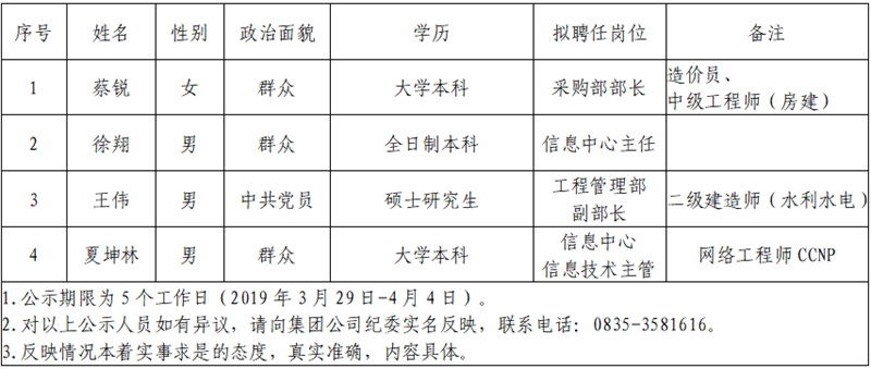 经雅安市交通建设(集团)有限责任公司研究,对以下4名拟聘用人员予以公示: