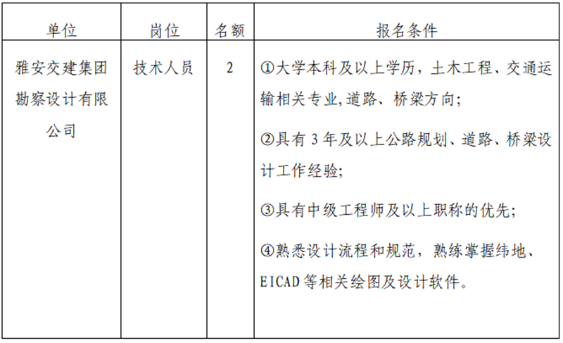 根据开展需要,决定面向社会公开招聘雅安市交通建设(集团)有限责任公司(以下简称“威廉希尔集团”)所属子公司工作人员2名,现将有关事项公告如下: