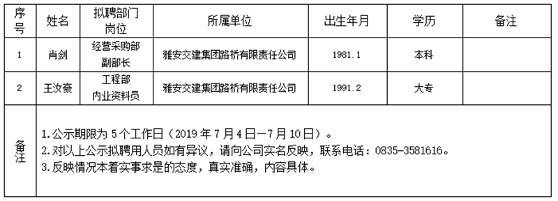 根据集团公司《人才选聘实施办法》,通过智联招聘报名、资格审查、面试、体检、考察等程序,经集团公司研究,对以下拟聘用人员予以公示: