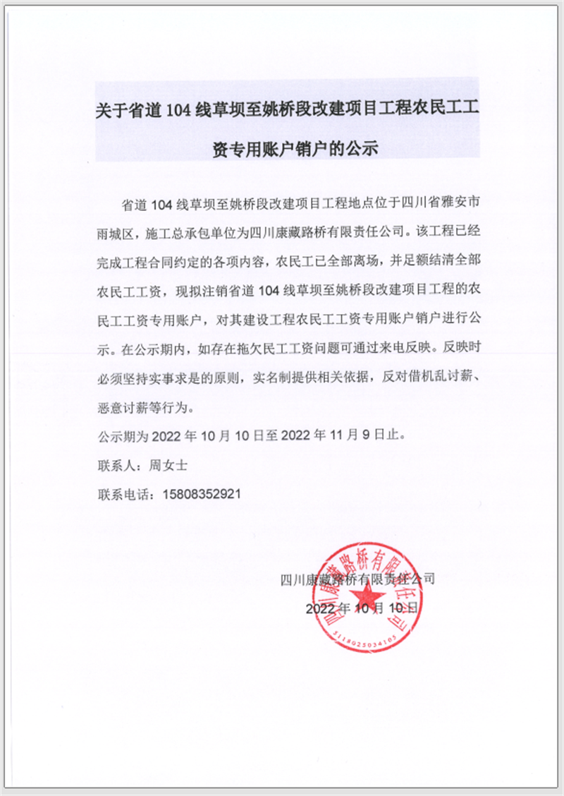 关于省道104线草坝至姚桥段改建项目工程农民工工资专用账户销户的公告