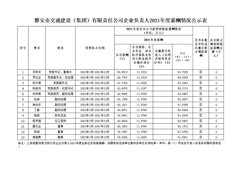 :雅安市交通建设(集团)有限责任公司企业负责人2021年度薪酬情况公示表