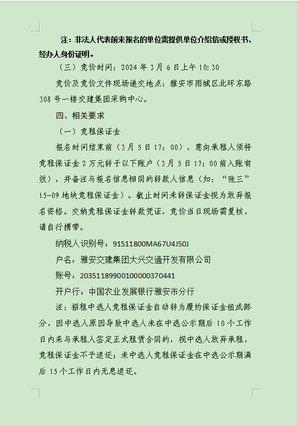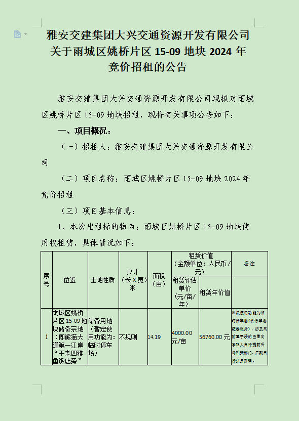 威廉希尔集团大兴交通资源开发有限公司关于雨城区姚桥片区15-09地块2024年竞价招租的公告附件