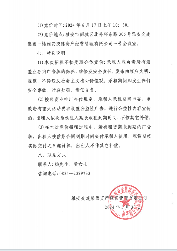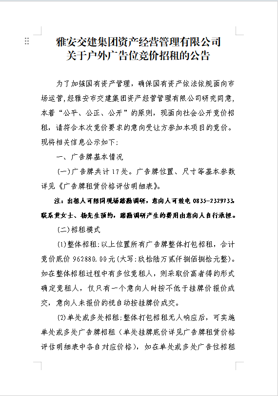 威廉希尔集团资产经营管理有限公司关于户外广告位竞价招租的公告