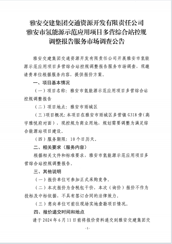 威廉希尔集团交通资源开发有限责任公司雅安市氢能源示范应用项目多营综合站控规调整报告服务市场调查公告