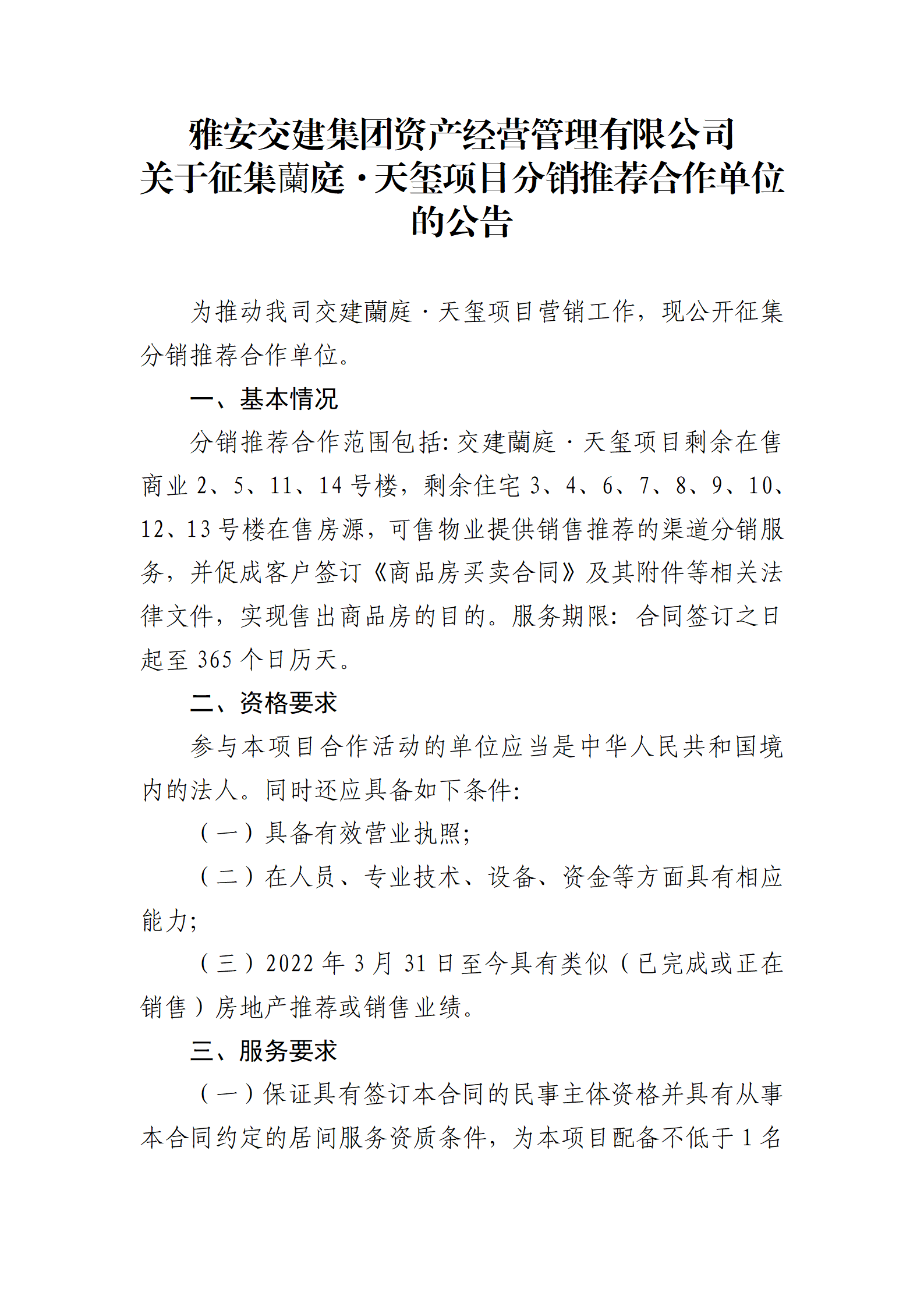 威廉希尔集团资产经营管理有限公司 关于征集蘭庭·天玺项目分销推荐合作单位的公告