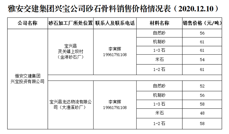 威廉希尔集团兴宝公司砂石骨料销售价格情况表(2020.12.10)