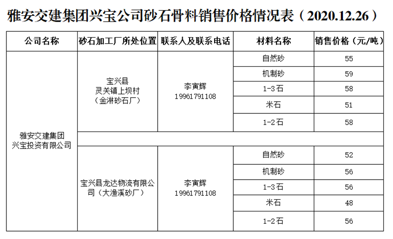 威廉希尔集团兴宝公司砂石骨料销售价格情况表(2020.12.26)