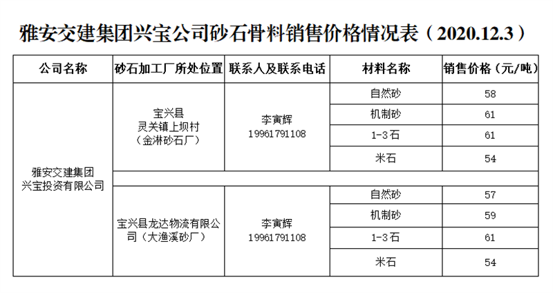 威廉希尔集团兴宝公司砂石骨料销售价格情况表(2020.12.3)