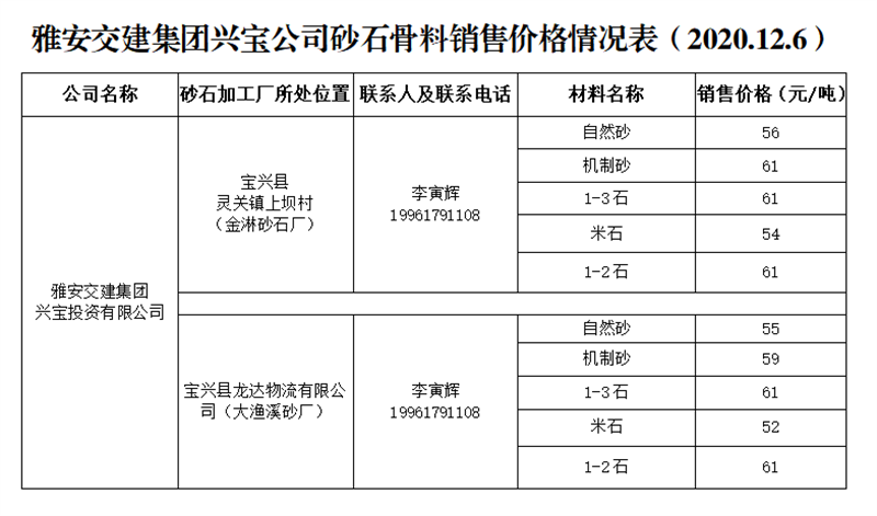 威廉希尔集团兴宝公司砂石骨料销售价格情况表(2020.12.6)