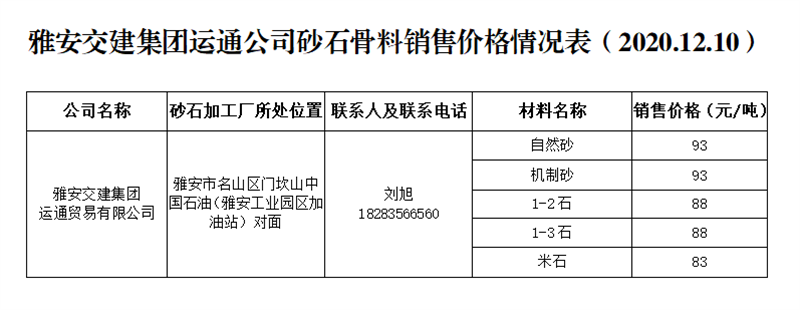 威廉希尔集团运通公司砂石骨料销售价格情况表(2020.12.10)