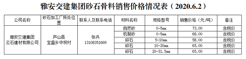 威廉希尔集团云石建材砂石骨料销售价格情况表(2020.6.2)