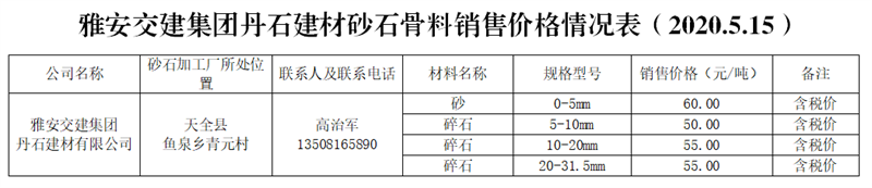 威廉希尔集团丹石建材砂石骨料销售价格情况表(2020.5.15)