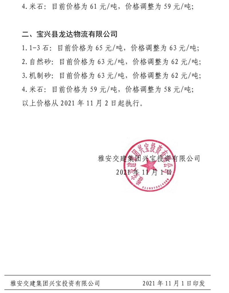 威廉希尔集团兴宝公司关于调整成品料销售价格的通知(2021.11.2)