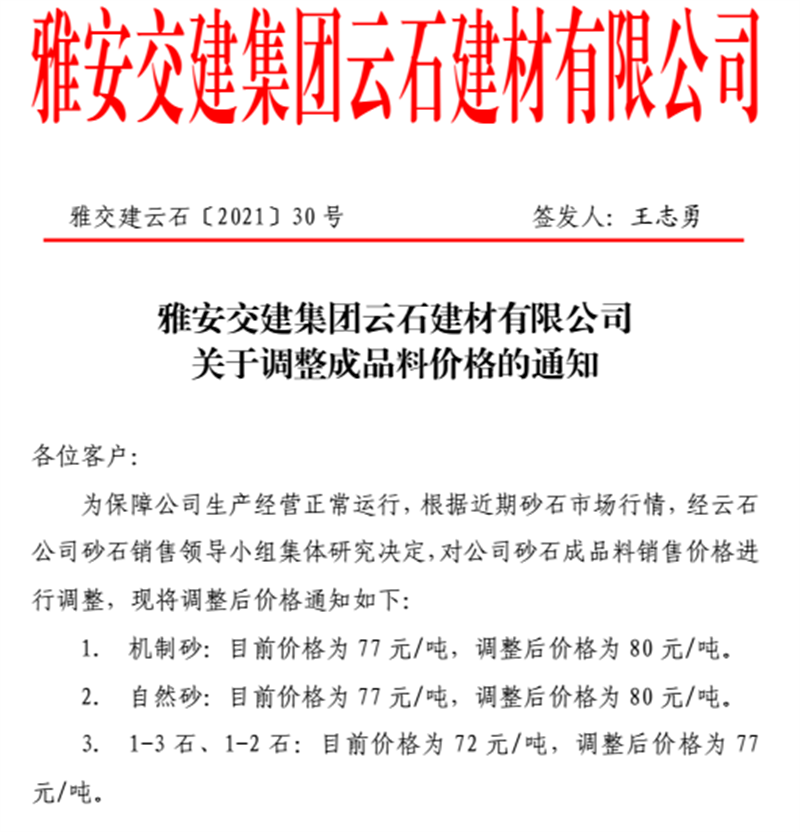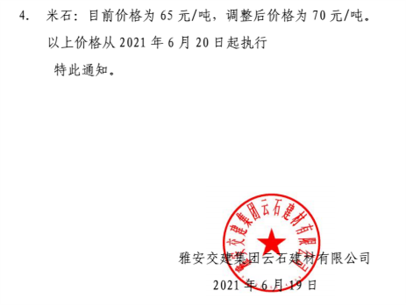 威廉希尔集团云石公司砂石骨料销售价格情况表(2021.6.20)
