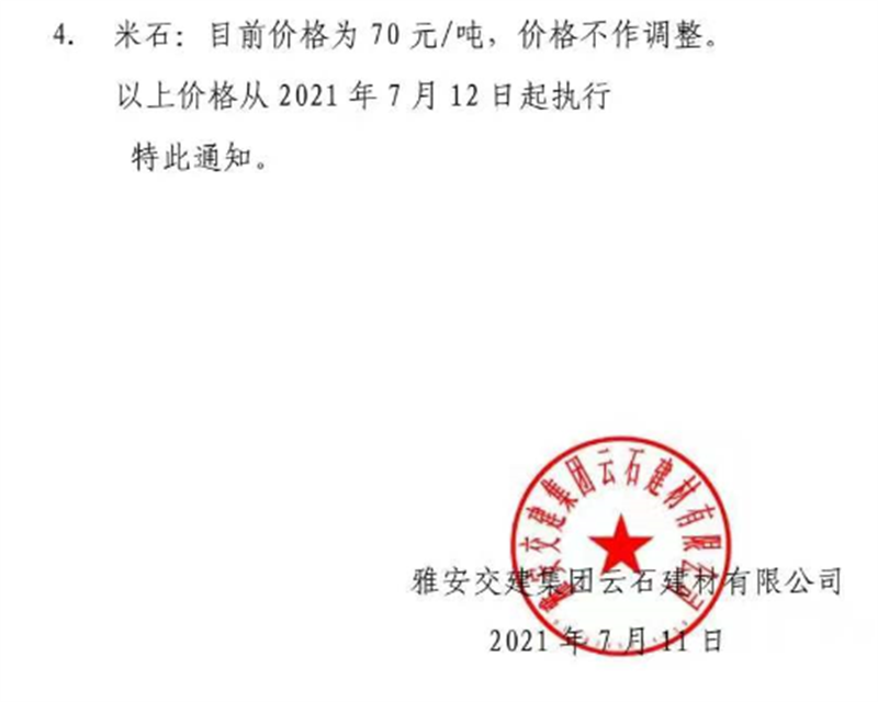 威廉希尔集团云石公司砂石骨料销售价格情况表(2021.7.12)