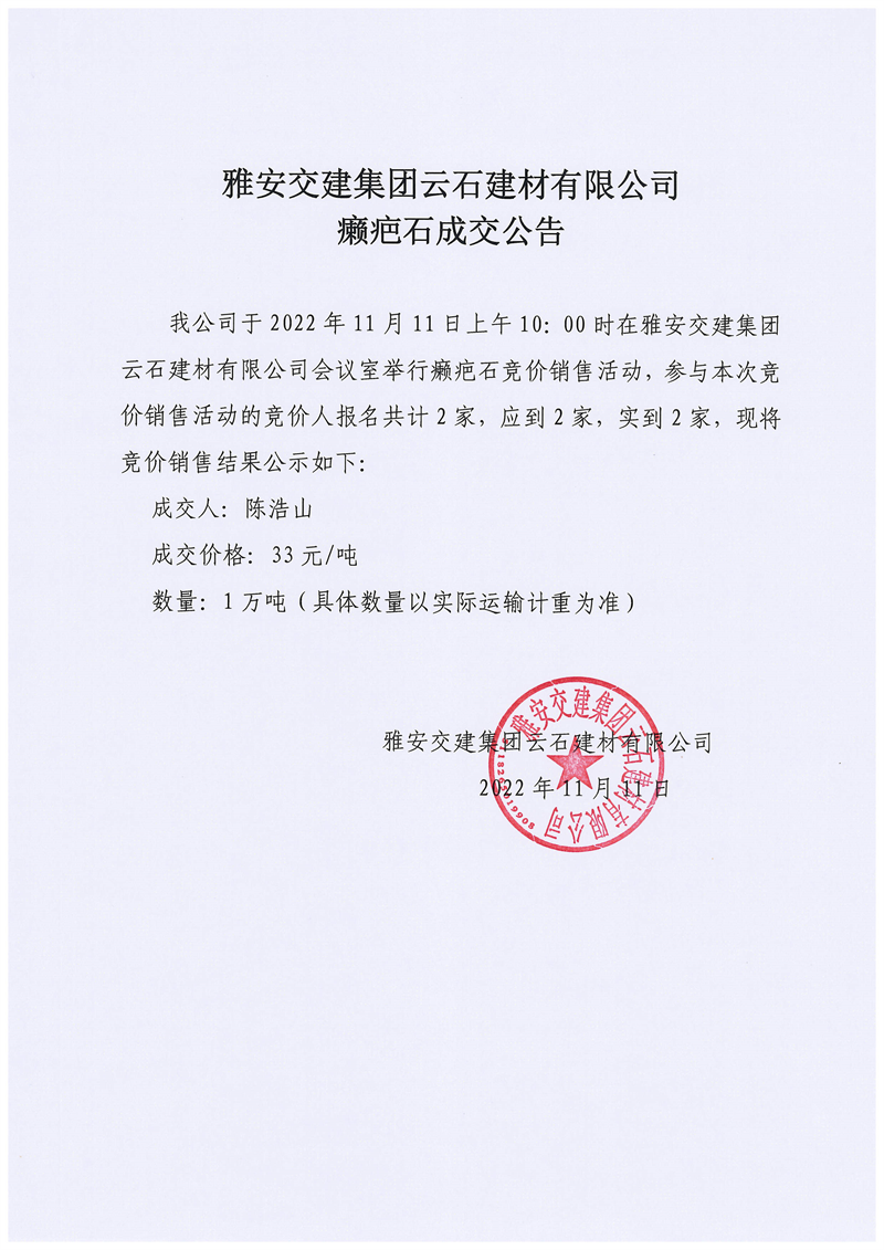 威廉希尔集团云石建材有限公司癞疤石成交公告11.11