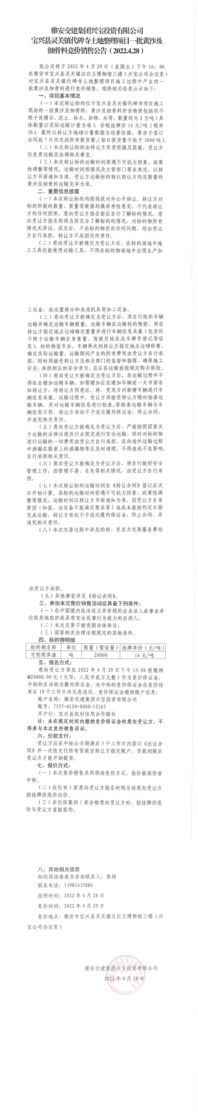 威廉希尔集团兴宝投资有限公司宝兴县灵关镇代碑寺土地整理项目一批黄沙及细骨料竞价销售公告(2022.4.28)
