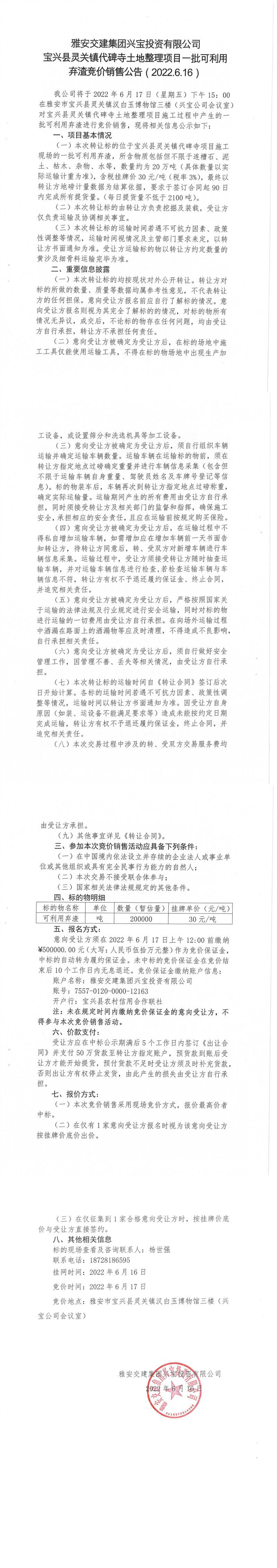 威廉希尔集团兴宝投资有限公司宝兴县灵关镇代碑寺土地整理项目-批可利用 弃渣第二次竞价销售公告( 2022.6.16 )