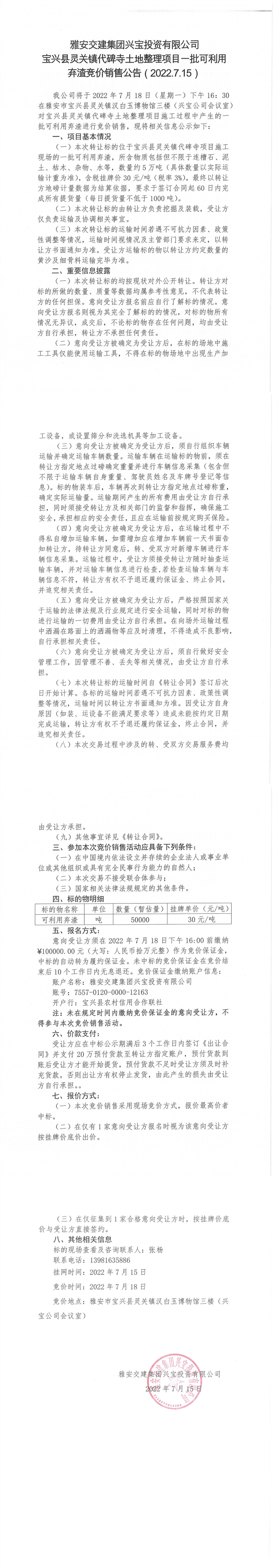 宝兴县灵关镇代碑寺土地整理项目一批可利用弃渣竞价销售公告7.18(5万吨)