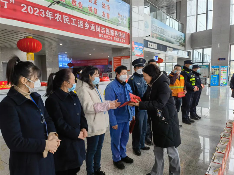 在雅安市汽车客运站,李蓉调研了工会系统2023年农民工返乡返岗志愿服务活动召开情况,看望慰问了民警、汽车客运站职工、保安保洁等春运一线人员,向大家致以新春祝福。李蓉要求,全市各级工会组织要统筹资源、精心组织,认真实行送温暖、农民工返乡返岗志愿服务活动等工作,切实把党和政府的关心关怀与工会组织的温暖送到广大职工群众心坎上。