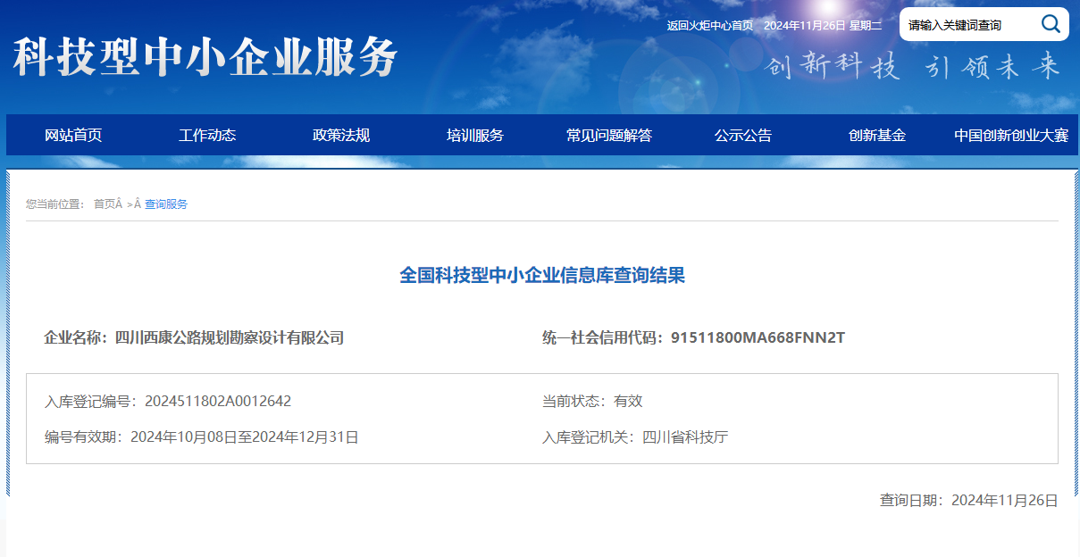 近期,四川省科学技术厅公布了本年度第五批入库科技型中小企业名单,威廉希尔集团四川西康公路规划勘察设计有限公司荣获“国家级科技型中小企业”称号,标志着公司在科技创新道路上迈向了新的高度。