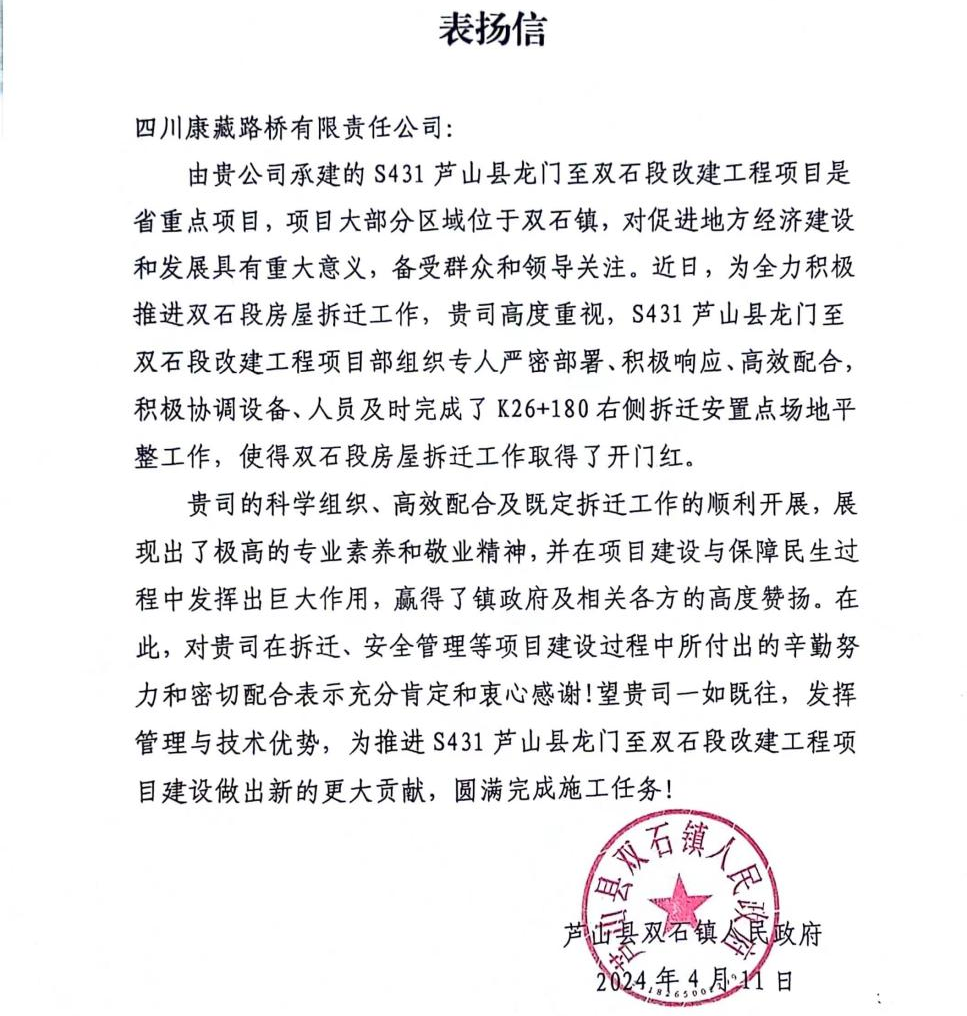 近期,威廉希尔集团四川康藏路桥有限责任公司收到来自芦山县双石镇人民政府的表扬信。信中对S431芦山县龙门至双石段改建工程项目部持续协调设备、人员配合当地政府完成K26+180右侧拆迁安置点场地平整工作,使得双石段房屋拆迁工作取得了开门红给予了高度评价和赞扬。