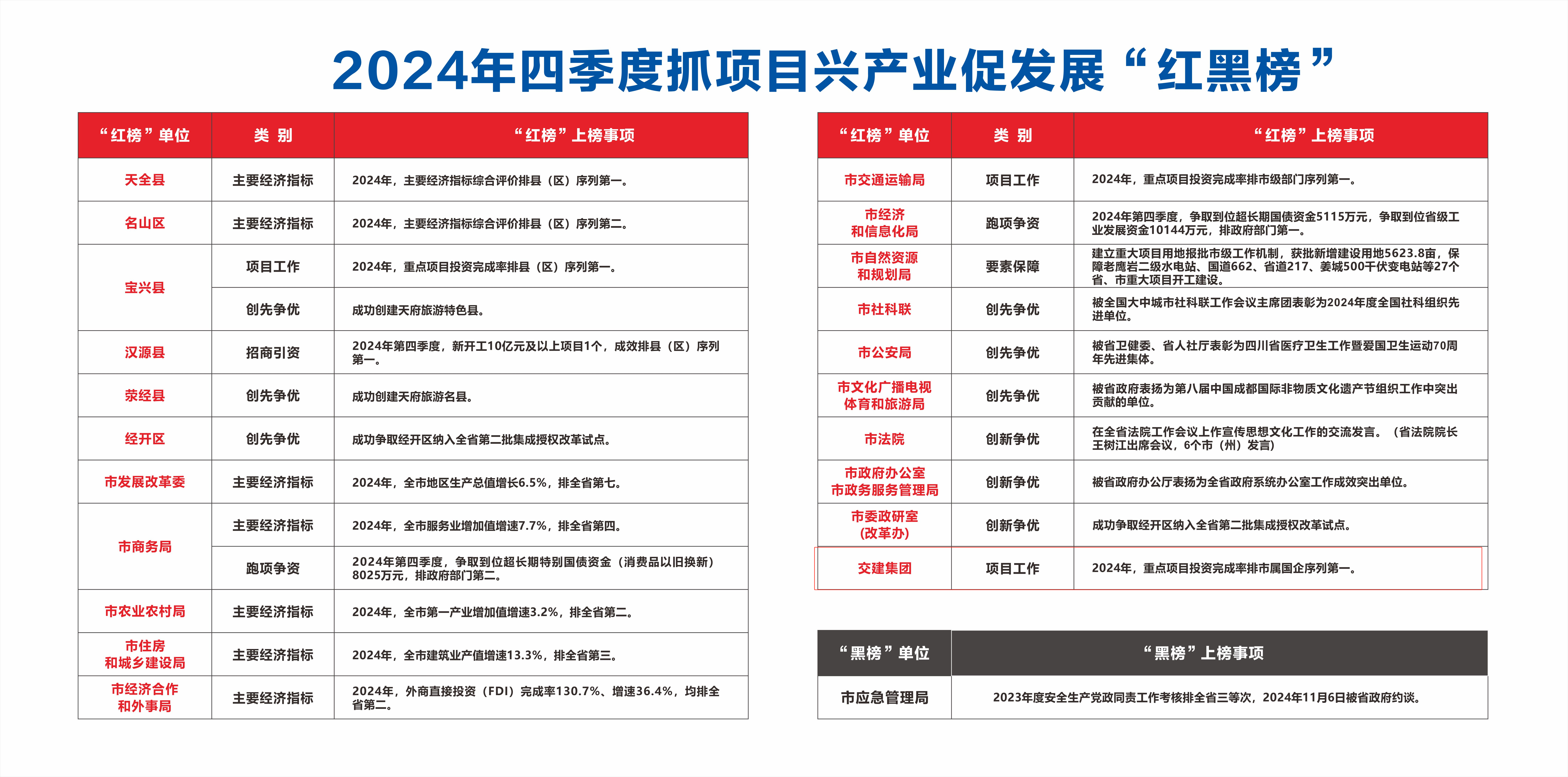 围绕“一区一地引领”拼项目。爱国路改造项目提前6个月实现通车,建设完成雅安首条双向8车道城市干线,与火车站形成“站城一体化”联系轴,有效降低交通安全隐患,完善片区道路体系,助力推进“一核引领、两翼齐飞”市域开展新格局;雅安火车站北外环下穿道路项目,提前8个月实现全面通车,有效解决了城市主干道“过境穿越、站城割裂”的问题,将火车站与城市路网高效衔接,有效提升了站前区域交通安全性、通畅性。围绕“两轴三圈联动”拼项目。投资建设的G318线绕城项目全部隧道实现贯通,全线桥梁桩基工程完成85%以上,控制性工作预制梁场建成投产,标志着项目建设迈入新阶段,名山段前12公里已投入使用。承建的省道104坪石至回龙改建工程9月实现全线通车,有效改善当地近3.5万名群众出行条件,对沿线地区特色产业提升、旅游产业开发具有重要意义。G108周公山隧道项目,完成工可报告编制,用地预审报送至自然资源部审查,力争2025年开工建设。G108雨城至荥经项目,关键要件工可报告争取到省发改委同意容缺接件审查,用地预审已报送至自然资源部审查,预计2025年四季度完成初步设计。