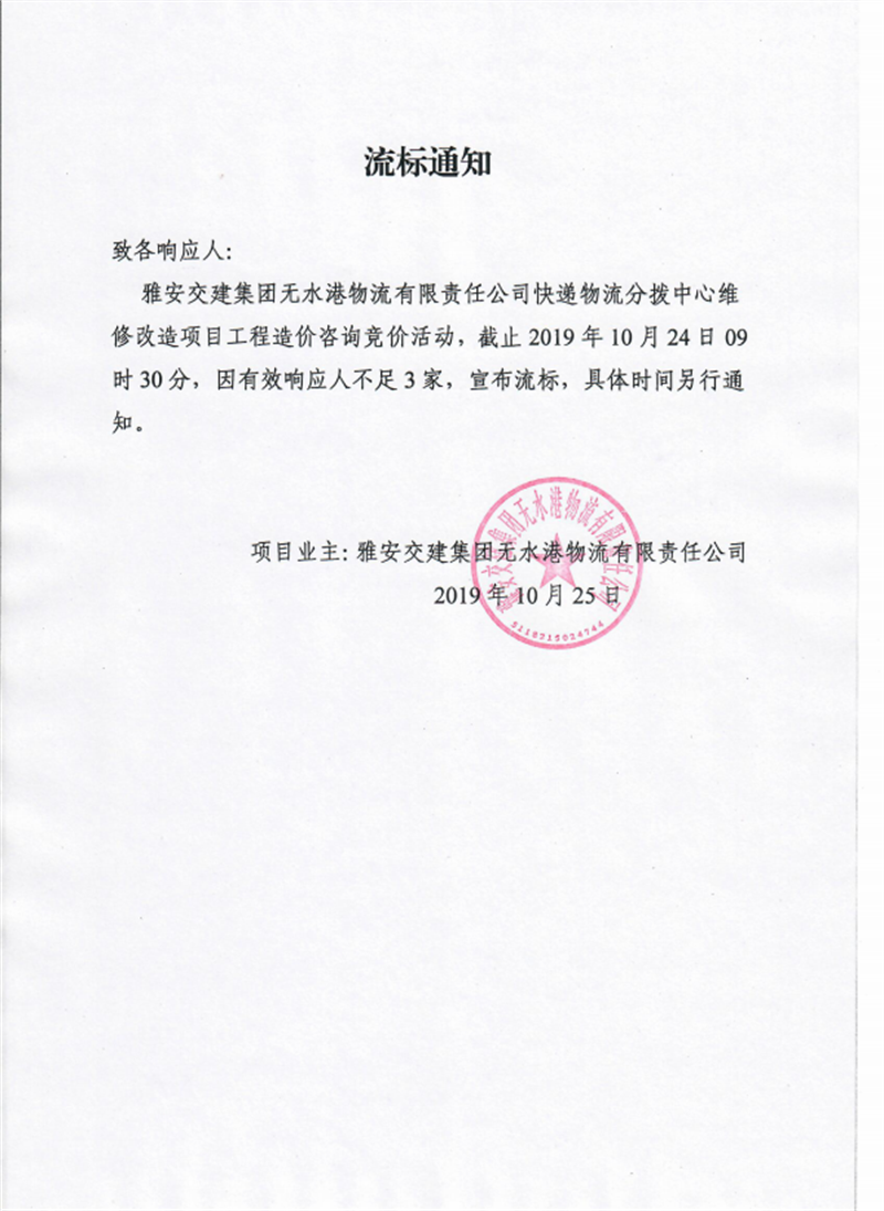 威廉希尔集团无水港物流有限责任公司快递物流分拨中心维修改造项目工程造价咨询竞价流标通知