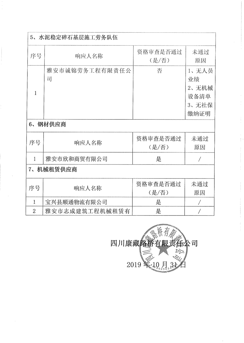 四川康藏路桥有限责任公司企业入库比选(补录)结果公示