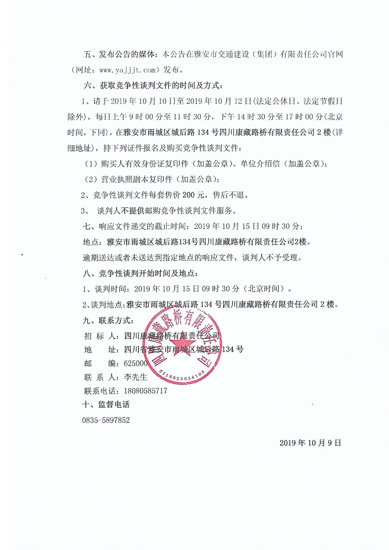 四川康藏路桥有限责任公司国道351线硗碛至夹金山路面改造工程波形护栏采购竞争性谈判结果公示