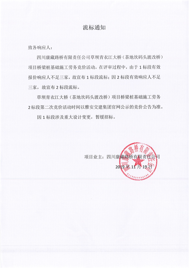 四川康藏路桥有限责任公司草坝青衣江大桥(茶地坎码头渡改桥)项目桥梁桩基础施工劳务竞价(1标段、2标段)流标通知