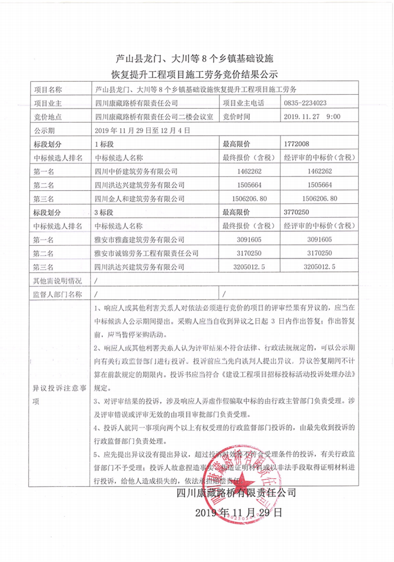 四川康藏路桥有限责任公司芦山县龙门、大川等8个乡镇基础设施恢复提升工程项目施工劳务竞价结果公示