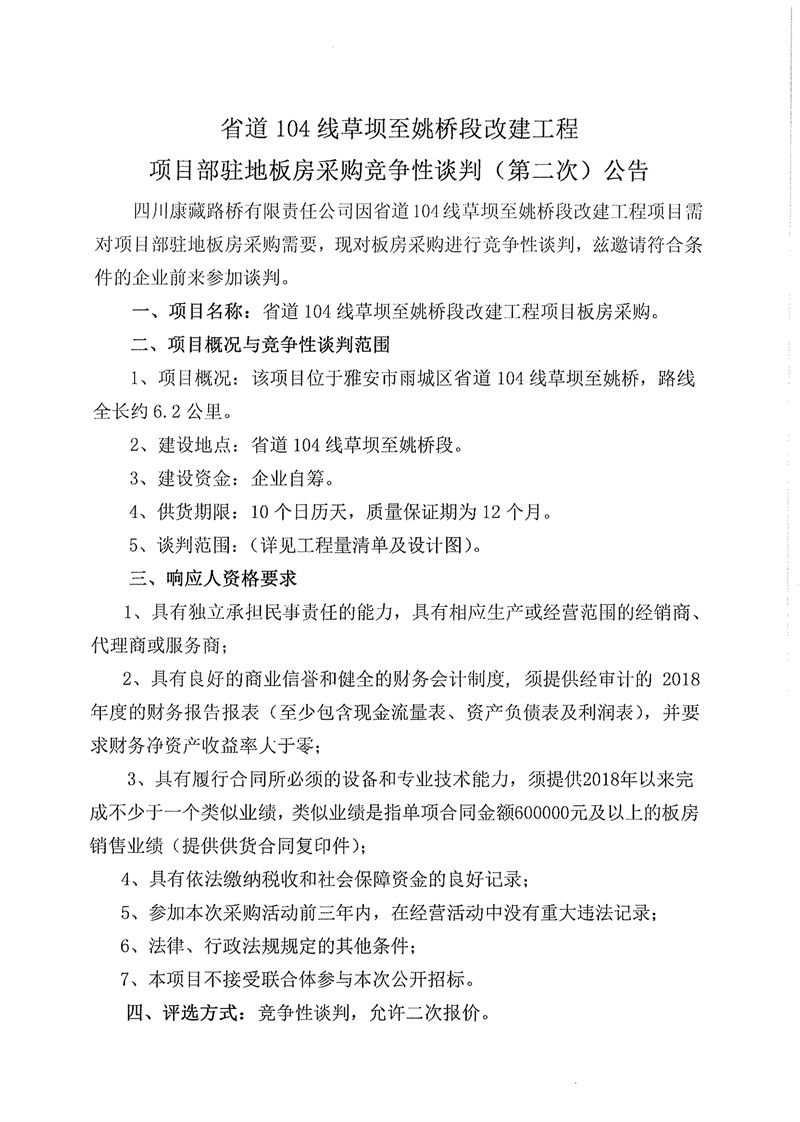 四川康藏路桥有限责任公司省道104线草坝至姚桥段改建工程项目部驻地板房采购竞争性谈判(第二次)公告