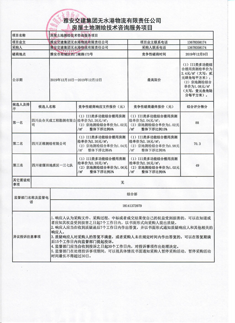 威廉希尔集团无水港物流有限责任公司房屋土地测绘技术咨询服务项目竞争性磋商结果公示